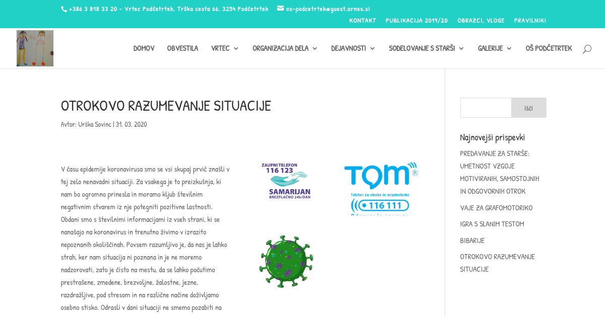 V času epidemije koronavirusa smo se vsi skupaj prvič znašli v tej zelo nenavadni situaciji. Za vsakega je to preizkušnja, ki nam bo ogromno prinesla in moramo kljub številnim negativnim stvarem iz nje potegniti pozitivne lastnosti. Obdani smo s številnimi informacijami iz vseh strani, ki se nanašajo na koronavirus in trenutno živimo v izrazito nepoznanih okoliščinah. Povsem razumljivo je, da nas je lahko strah, ker nam situacija ni poznana in je ne moremo nadzorovati, zato je čisto na mestu, da se lahko počutimo prestrašene, zmedene, brezvoljne, žalostne, jezne, razdražljive, pod stresom in na različne načine doživljamo osebno stisko. Odrasli v dani situaciji ne smemo pozabiti na naše otroke. Tudi za njih je situacija popolnoma nepoznana in prav tako lahko doživljajo stisko zaradi številnih nejasnosti, ki se pojavijo pri otrokovem dojemanju situacije. Otroci v trenutni situaciji pridobivajo številne informacije, ki jih slišijo po televiziji, radiu, med pogovori odraslih in si jih razlagajo po svoje. Pomembno je, da se z otrokom odkrito pogovorimo, mu nastalo situacijo pojasnimo, tudi s slikami in z besediščem, ki je primerno njegovi stopnji razvoja in mu na ta način približamo razumevanje situacije ter pripomoremo k otrokovemu sprejemanju situacije. In kar je najpomembnejše, otrokom dajmo prepričanje, da so varni.
