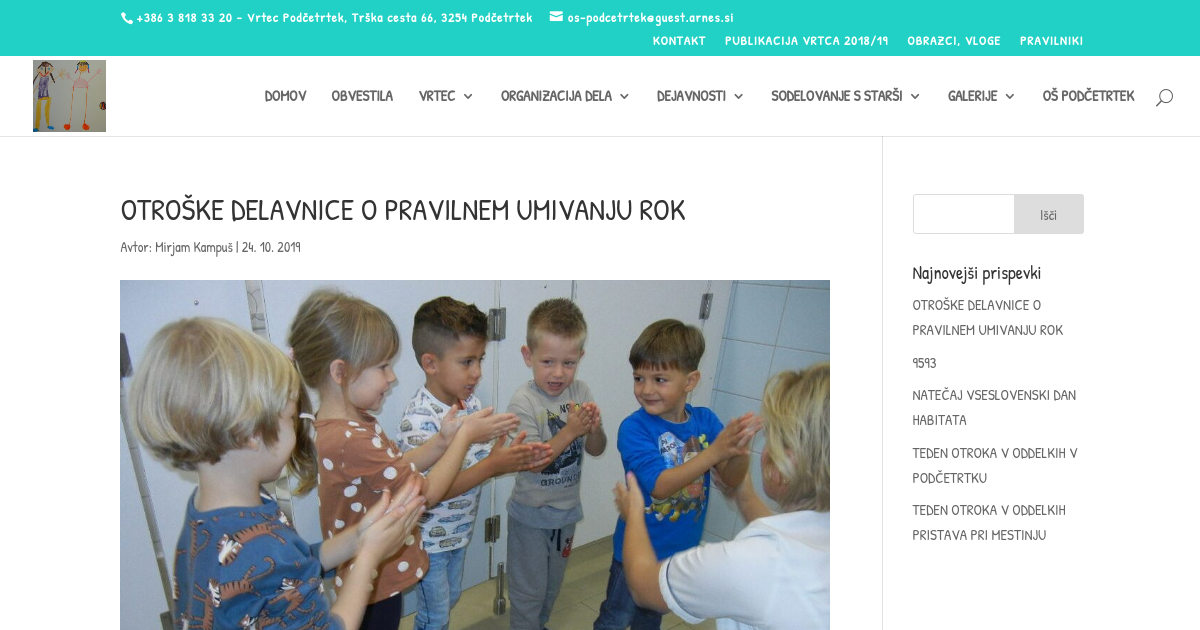 Zdravje predstavlja splošno vrednoto in bistveni vir za produktivno in kakovostno življenje slehernega posameznika in skupnosti kot celote. Skrb za dobro počutje in zdravje naših otrok zato uvrščamo med prioritetne naloge našega vrtca. V tednu med 14. in 18.10.2019 so v vrtcu potekale delavnice o pravilnem postopku umivanja rok. Zelo pomembno je, da otroke že od malih nog seznanjamo o pogostosti umivanja rok ter o pravilnem postopku med umivanjem. Z delavnicami, prilagojenimi glede na različno starosti, želimo na zabaven način prikazati kako zabavno je čiščenje rok. V sodelovanju z gospo Natalijo Klun iz ZD Šmarje pri Jelšah, ki je otrokom predstavila pravljico oz. prstno igrico ter izvedla praktični del pravilnega postopka umivanja rok. Otroci so se tako seznanili kaj so bakterije in virusi, zakaj so za nas nevarni ter kdaj se morajo roke umiti ter po kakšnem postopku.