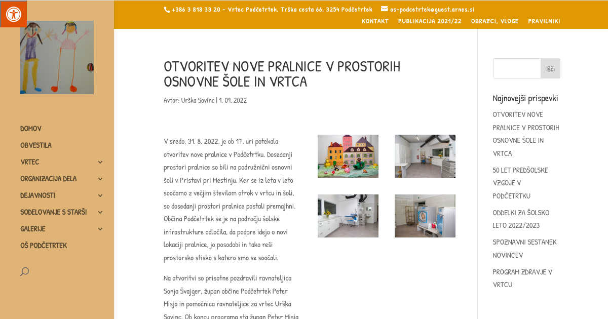 V sredo, 31. 8. 2022, je ob 17. uri potekala otvoritev nove pralnice v Podčetrtku. Dosedanji prostori pralnice so bili na podružnični osnovni šoli v Pristavi pri Mestinju. Ker se iz leta v leto soočamo z večjim številom otrok v vrtcu in šoli, so dosedanji prostori pralnice postali premajhni. Občina Podčetrtek se je na področju šolske infrastrukture odločila, da podpre idejo o novi lokaciji pralnice, jo posodobi in tako reši prostorsko stisko s katero smo se soočali.