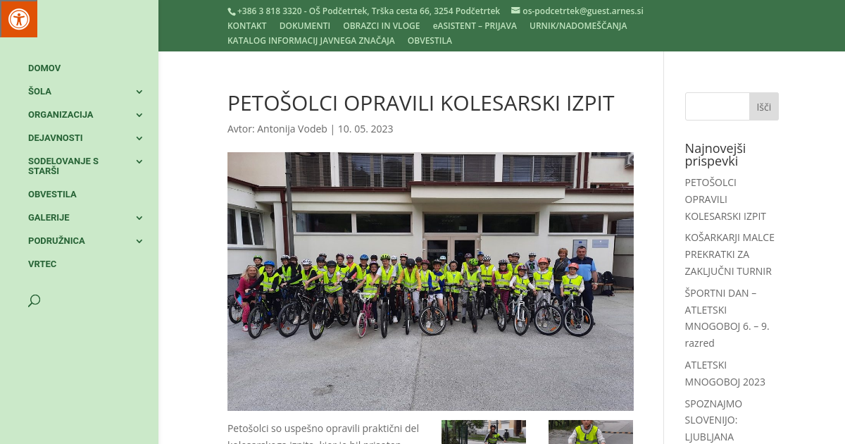 Petošolci so uspešno opravili praktični del kolesarskega izpita, kjer je bil prisoten tudi policist PP Šmarje pri Jelšah. Pokazali so, da znajo upoštevati pravila in se pravilno obnašati v prometu. Na začetku je bilo kar nekaj treme, napak, a so jih kasneje odpravili. Policist jih je pohvalil in še posebej opozoril na nevarnosti v cestnem prometu. Vsem učencem čestitamo in jim želimo varno vožnjo in ne pozabite, da BISTRO GLAVO VEDNO VARUJE ČELADA.