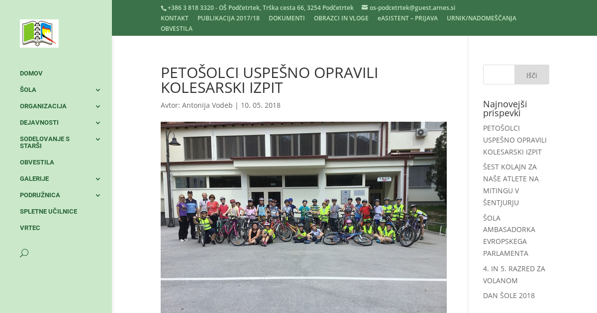 Petošolci so opravljali praktični del kolesarskega izpita, kjer prenesli svoje teoretično znanje iz prometa na prometne površine. Pravilno so se vključevali v promet, upoštevali prometne znake in predpise in opazovali promet okrog sebe in se temu primerno obnašali. Največ težav jim je povzročalo zavijanje v levo. Njihovo vožnjo so ocenjevali učitelji in policist g. Marko Krč. Vsi učenci so uspešno opravili kolesarski izpit in si prislužili kolesarsko izkaznico.