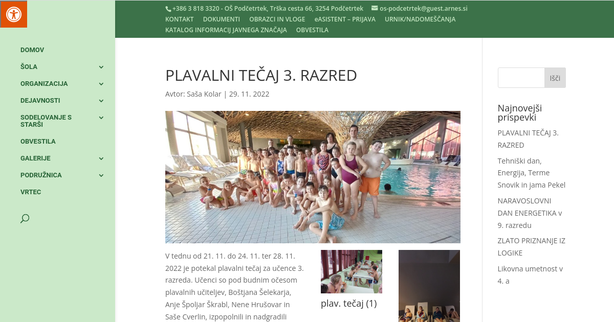V tednu od 21. 11. do 24. 11. ter 28. 11. 2022 je potekal plavalni tečaj za učence 3. razreda. Učenci so pod budnim očesom plavalnih učiteljev, Boštjana Šelekarja, Anje Špoljar Škrabl, Nene Hrušovar in Saše Cverlin, izpopolnili in nadgradili plavalno znanje, se naučili plavati, skakali v vodo, iskali »ježke«, nabirali plavalne izkušnje in osvojili plavalna priznanja. 23 učencev je osvojilo priznanje bronasti delfin, 6 učencev priznanje delfinček, eden zlatega konjička in 2 učenca priznanje srebrni konjiček. Ob koncu plavalnega tečaja so učenci obiskali 7D kino in se posladkali s sladoledom.