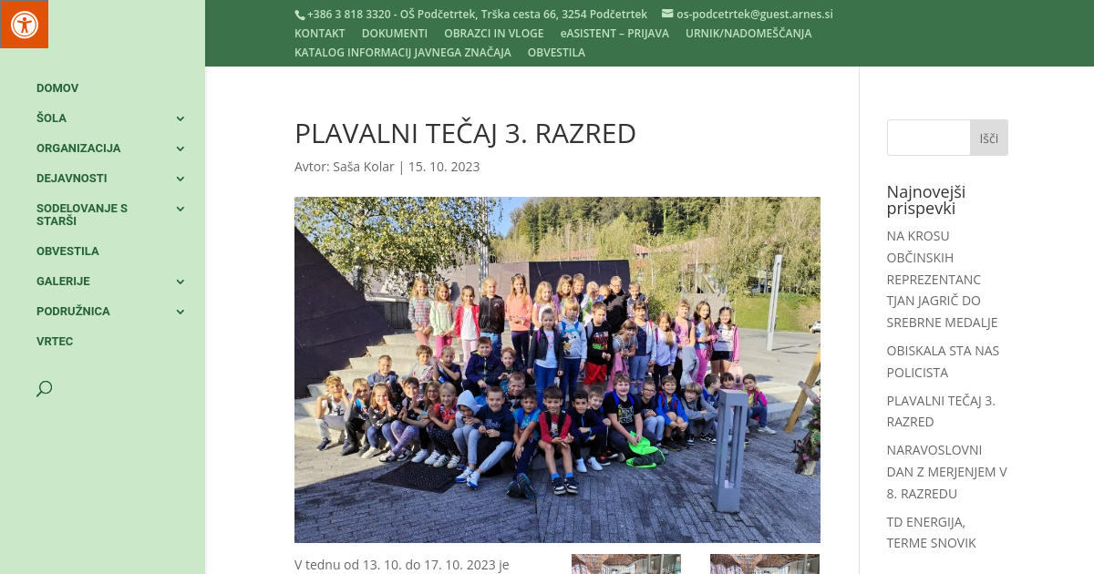 V tednu od 13. 10. do 17. 10. 2023 je potekal plavalni tečaj za učence 3. razreda. Učenci so pod budnim očesom plavalnih učiteljev, Ajde Kolar, Anje Špoljar Škrabl, Nene Hrušovar, Davida Ivačiča in Saše Cverlin, izpopolnili in nadgradili plavalno znanje, se naučili plavati, skakali v vodo, iskali »ježke«, nabirali plavalne izkušnje in osvojili plavalna priznanja. 27 učencev je osvojilo priznanje bronasti delfin, 10 učencev priznanje delfinček, 5 učencev zlatega konjička, 2 učenca priznanje srebrni konjiček in eden bronastega konjička. Za nagrado so se za celotedenski trud in plavalno uspešnost posladkali s sladoledom.