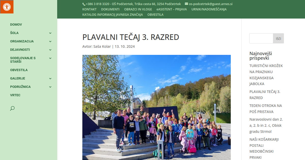V tednu otroka, od 7. do 11. oktobra 2024, so tretješolci opravili plavalni tečaj. Učenci so pod budnim očesom plavalnih učiteljev, Boštjana Šelekarja, Nene Hrušovar, Davida Ivačiča (Kaje Berk), Suzane Bitežnik, Nives Turk in Saše Cverlin, se naučili plavati, izpopolnili in nadgradili plavalno znanje, skakali v vodo, iskali »ježke«, nabirali plavalne izkušnje in kondicijo ter osvojili plavalna priznanja. 20 učencev je osvojilo priznanje bronasti delfin in tako so postali plavalno opismenjeni, 15 učencev priznanje delfinček, 8 učencev srebrnega konjička in 2 učenca bronastega konjička. Za celotedenski trud in vloženega veliko dela ter energije, so se za nagrado posladkali s sladoledom.