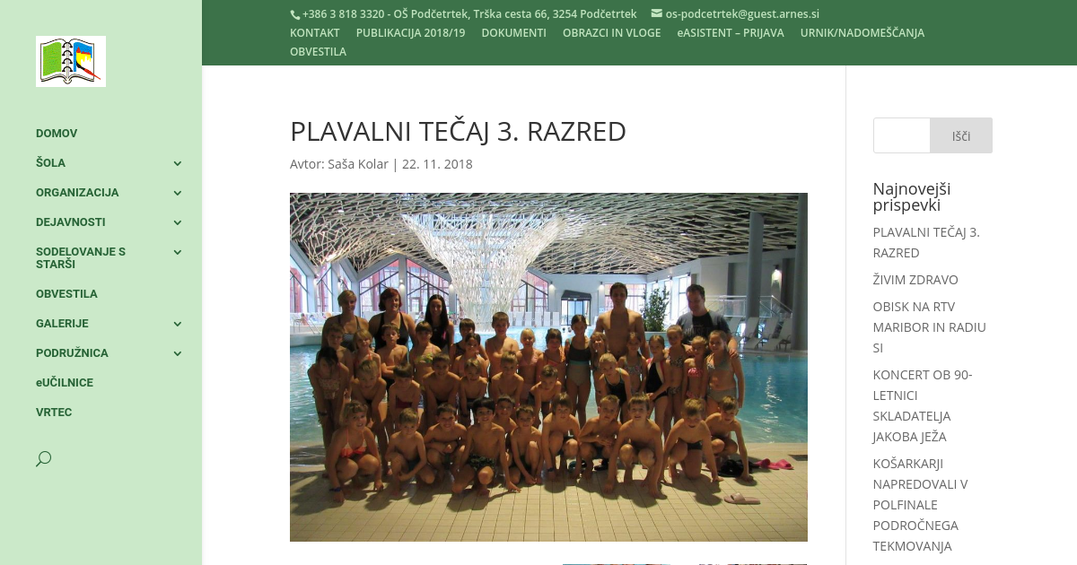 V tednu od 12. do 16. novembra 2018 smo z učenci 3. razredov izvajali plavalni tečaj. Pod budnim očesom plavalnih učiteljev, Boštjana Šelekarja, Mateje Bališ (Davida Ivačiča), Anje Špoljar Škrabl, Sare Masnec in Saše Kolar, so se učenci naučili plavati in izpopolnili plavalno znanje, skakali v vodo, iskali »ježke« in osvojili plavalna priznanja. 20 učencev je osvojilo bronastega delfina, 8 učencev priznanje delfinček, 4 učenci zlatega konjička, 2 učenca srebrnega konjička in 2 učenca bronastega konjička. Plavalni teden smo zaključili s sladkanjem s sladoledom.