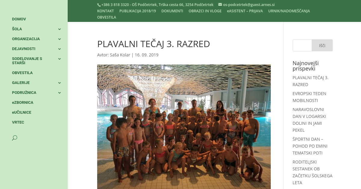 V tednu od 9. do 13. septembra 2019 smo z učenci 3. razredov izvajali plavalni tečaj. Pod budnim očesom plavalnih učiteljev, Boštjana Šelekarja, Davida Ivačiča, Anje Špoljar Škrabl, Katje Poharc in Saše Kolar, so se učenci naučili plavati in izpopolnili plavalno znanje, skakali v vodo, iskali »ježke« in osvojili plavalna priznanja. 26 učencev je osvojilo bronastega delfina, 7 učencev priznanje delfinček, 5 učencev zlatega konjička, 3 učenci srebrnega konjička in 1 učenec bronastega konjička. Plavalni teden smo zaključili s sladkanjem s sladoledom.