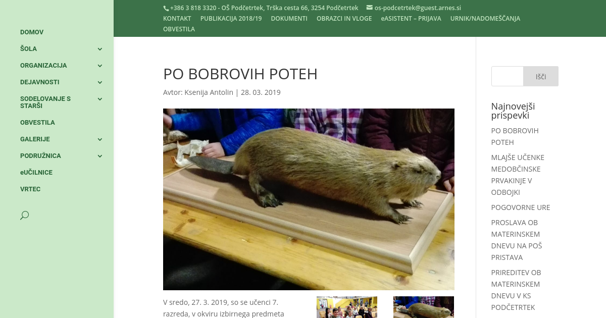 V sredo, 27. 3. 2019, so se učenci 7. razreda, v okviru izbirnega predmeta Organizmi v naravi in umetnem okolju, udeležili srečanja mreže šol biosfernega območja Kozjansko in Obsotelje, ki je potekalo v Kozjem. Srečanje so organizirali strokovni delavci Kozjanskega parka ter učencem omogočili predavanje ter nato voden sprehod po habitatu bobra na reki Bistrici.