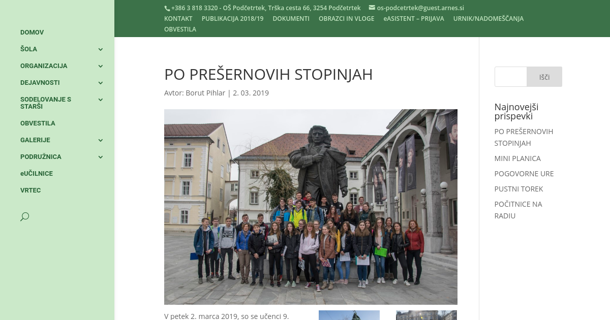 V petek 2. marca 2019, so se učenci 9. razredov podali po »Prešernovih stopinjah«. Pot jih je vodila v tri slovenske kraje, ki so najbolj zaznamovali pesnikovo življenje (Vrba, Kranj, Ljubljana). Spoznali so Prešernovo življenje, delo ter pomen za Slovence. Dan je minil v prav prešernem vzdušju.