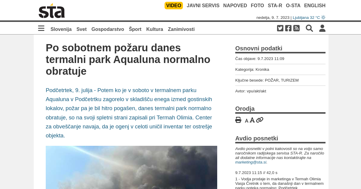 Potem ko je v soboto v termalnem parku Aqualuna v Podčetrtku zagorelo v skladišču enega izmed gostinskih lokalov, požar pa je bil hitro pogašen, danes termalni park normalno obratuje, so na svoji spletni strani zapisali pri Termah Olimia. Center za obveščanje navaja, da je ogenj v celoti uničil inventar ter ostrešje objekta.
