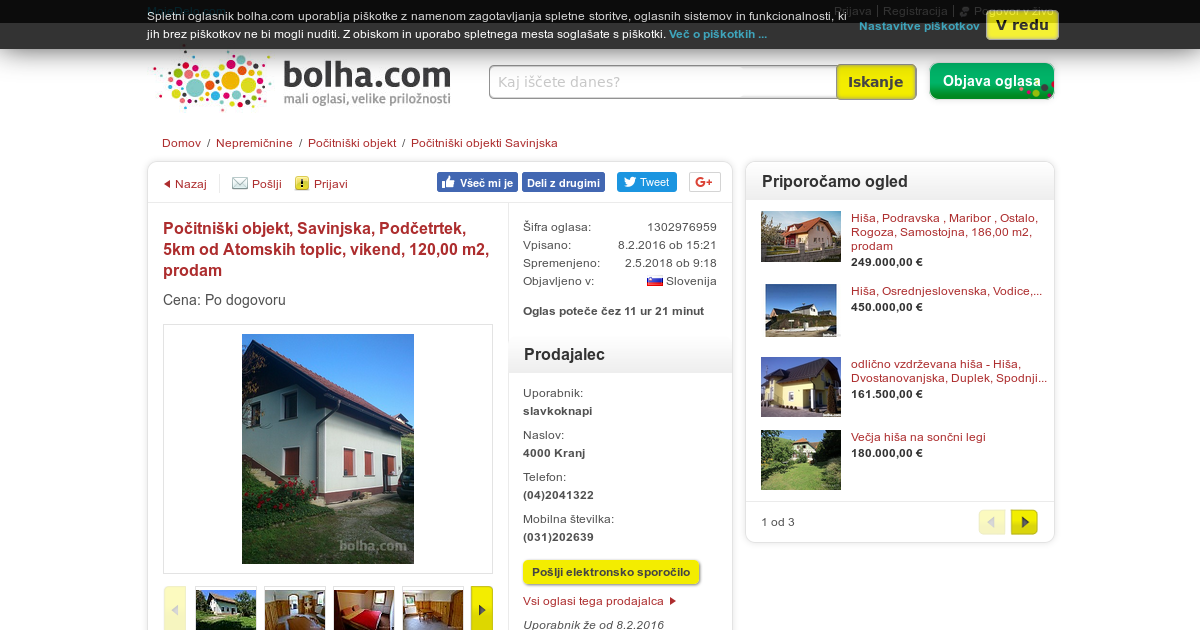 Kraj/naselje: 5km od Atomskih toplic Tip:vikend Velikost: 120, 00 m2 Velikost parcele: 1800, 00 m2 Leto izgradnje: 1997