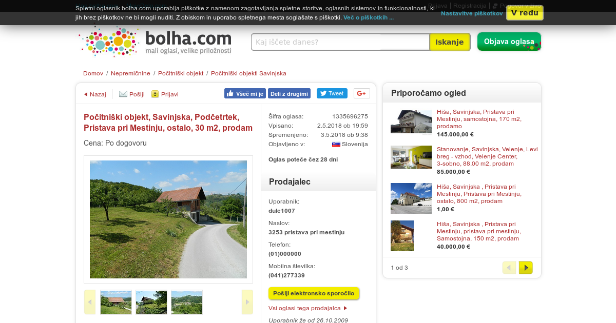 Kraj/naselje: Pristava pri Mestinju Tip:ostalo Velikost: 30, 00 m2 Velikost parcele: 700, 00 m2 Leto izgradnje: 1990