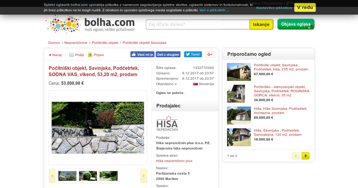 Kraj/naselje: SODNA VAS Tip:vikend Velikost: 53, 20 m2 Velikost parcele: 412, 00 m2 Leto izgradnje: 1975