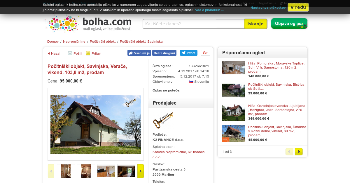 Tip: Vikend Velikost: 103, 80 m2 Velikost parcele: 4750, 00 m2 Leto izgradnje: 1965 Zadnja adaptacija: 2004