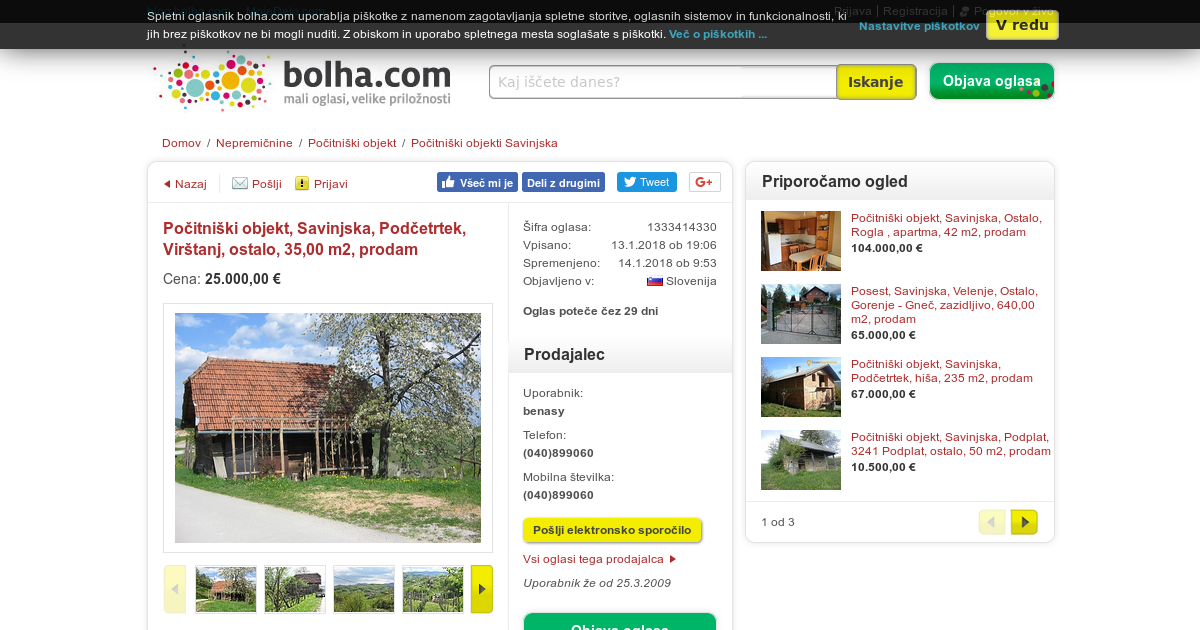 Kraj/naselje: Virštanj Tip:ostalo Velikost: 35, 00 m2 Velikost parcele: 2234, 00 m2 Leto izgradnje: 1957