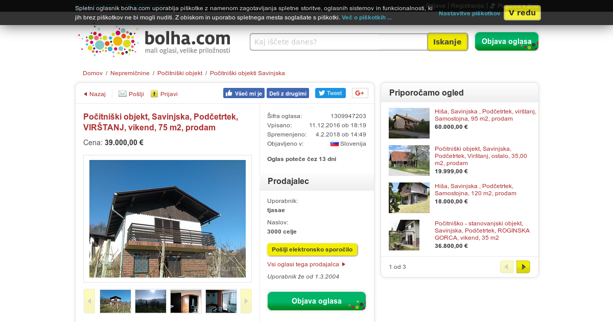 Kraj/naselje: VIRŠTANJ Tip:vikend Velikost: 75, 00 m2 Velikost parcele: 1800, 00 m2 Leto izgradnje: 1984