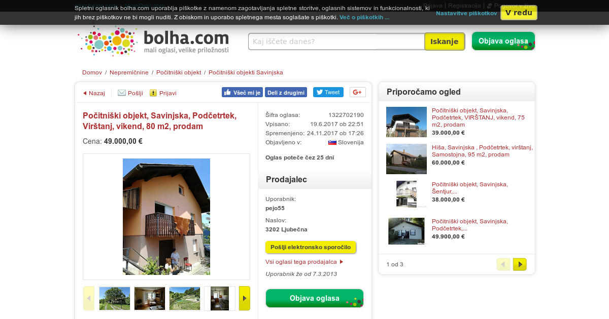 Kraj/naselje: Virštanj Tip:vikend Velikost: 80, 00 m2 Velikost parcele: 1350, 00 m2 Leto izgradnje: 1980 Zadnja adaptacija: 2012