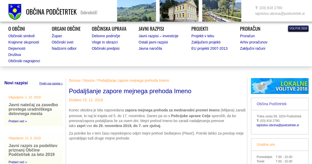 Konec oktobra je bila napovedana zapora mejnega prehoda za mednarodni promet Imeno (Miljana) zaradi prenove, ki naj bi trajala od 5. do 17. novembra. Danes pa so s Policijske uprave Celje sporočili, da bo prenova/zapora podaljšana še za osem dni. Mejni prehod Imeno bo zaradi nadaljevanja prenove tako zaprt vse do 25. novembra 2019, do 7. ure zjutraj. Za potnike bo v