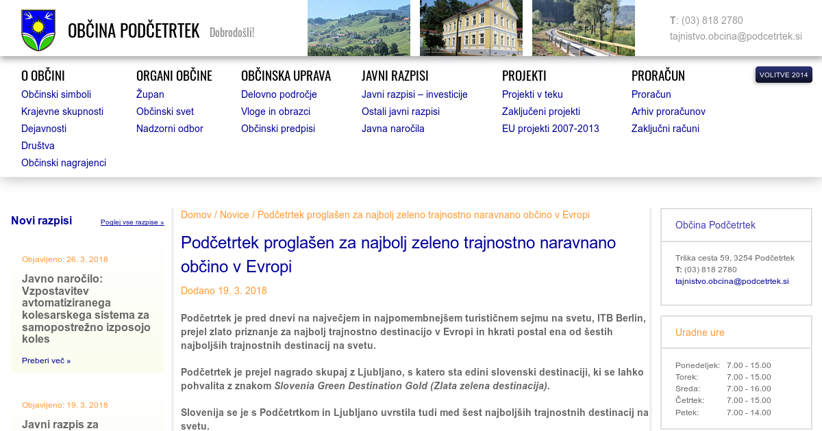 Podčetrtek je pred dnevi na največjem in najpomembnejšem turističnem sejmu na svetu, ITB Berlin, prejel zlato priznanje za najbolj trajnostno destinacijo v Evropi in hkrati postal ena od šestih najboljših trajnostnih destinacij na svetu. Podčetrtek je prejel nagrado skupaj z Ljubljano, s katero sta edini slovenski destinaciji, ki se lahko pohvalita z znakom Slovenia Green Destination Gold