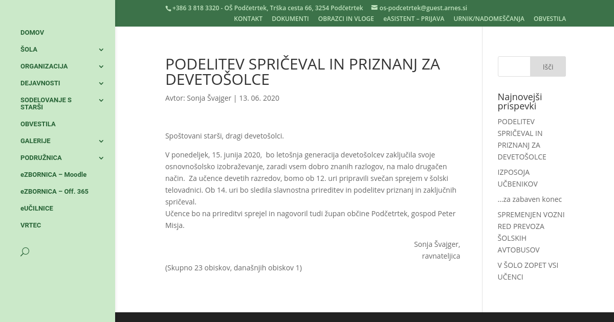 PODELITEV SPRIČEVAL IN PRIZNANJ ZA DEVETOŠOLCE