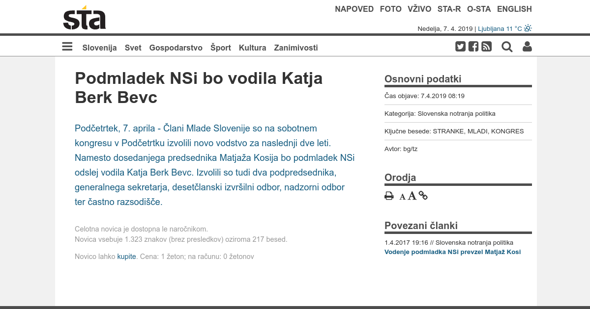 Člani Mlade Slovenije so na sobotnem kongresu v Podčetrtku izvolili novo vodstvo za naslednji dve leti. Namesto dosedanjega predsednika Matjaža Kosija bo podmladek NSi odslej vodila Katja Berk Bevc. Izvolili so tudi dva podpredsednika, generalnega sekretarja, desetčlanski izvršilni odbor, nadzorni odbor ter častno razsodišče.