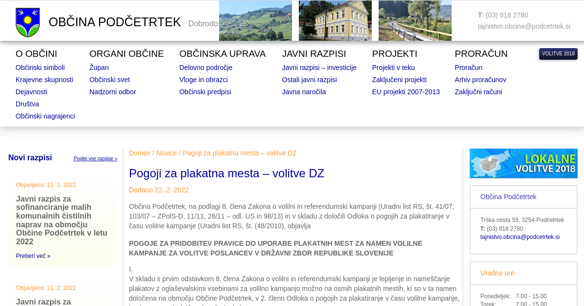 Občina Podčetrtek, na podlagi 8. člena Zakona o volilni in referendumski kampanji (Uradni list RS, št. 41/07, 103/07 – ZPolS-D, 11/11, 28/11 – odl. US in 98/13) in v skladu z določili Odloka o pogojih za plakatiranje v času volilne kampanje (Uradni list RS, št. (48/2010), objavlja POGOJE ZA PRIDOBITEV PRAVICE DO UPORABE PLAKATNIH MEST ZA