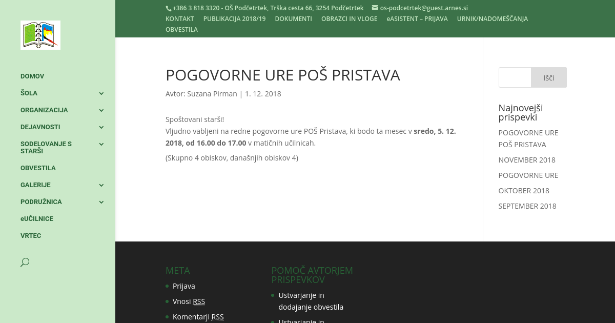 Spoštovani starši! Vljudno vabljeni na redne pogovorne ure POŠ Pristava, ki bodo ta mesec v sredo, 5. 12. 2018, od 16.00 do 17.00 v matičnih učilnicah.