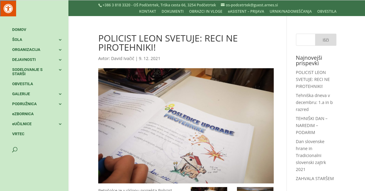 Petošolce je v sklopu projekta Policist Leon svetuje obiskal policist policijske postaje Šmarje pri jelšah Marko Krč. Za začetek je učencem razdeli delovne zvezke in predstavil projekt, ki ga ob koncu šolskega leta zaključimo z izletom presenečenja. Lansko leto so tako petošolci obiskali policijsko postajo vodnikov službenih psov in konjenikov Maribor, kjer so jim prijazni uslužbenci predstavili njihovo delo. V nadaljevanju je policist Marko učencem predstavil posledice uporabe pirotehnike. Predstavitev se je učencev zelo dotaknila, saj marsikdo ni vedel, da je lahko uporaba pirotehničnih sredstev tako nevarna za okolje in njihovo zdravje. Učenci so postavil kar nekaj vprašanj, na katere je policist Marko z veseljem odgovarjal. Ob koncu jim je zaželel mirne in prijetne praznike ter jih spomnil na učenje teorije za kolesarki izpit, ki jih čaka v spomladanskih mesecih.