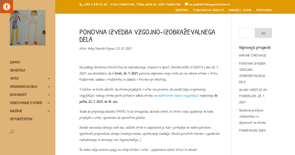 Na podlagi okrožnice Ministrstva za izobraževanje, znanost in šport, številka 6030-2/2021/4 z dne 20. 1. 2021, vas obveščamo, da v torek, 26. 1. 2021, ponovno odpiramo svoja vrata za vse zdrave otroke v Vrtcu Podčetrtek, oddelki v Podčetrtku in oddelki v Pristavi pri Mestinju.