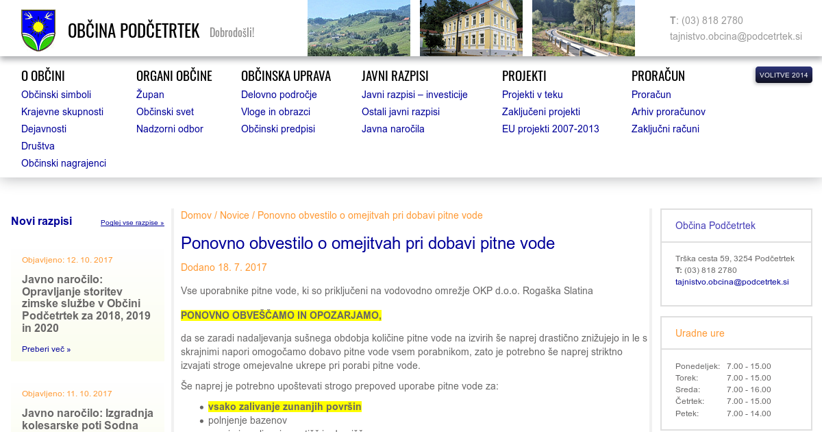 Vse uporabnike pitne vode, ki so priključeni na vodovodno omrežje OKP d.o.o. Rogaška Slatina PONOVNO OBVEŠČAMO IN OPOZARJAMO, da se zaradi nadaljevanja sušnega obdobja količine pitne vode na izvirih še naprej drastično znižujejo in le s skrajnimi napori omogočamo dobavo pitne vode vsem porabnikom, zato je potrebno še naprej striktno izvajati stroge omejevalne ukrepe pri