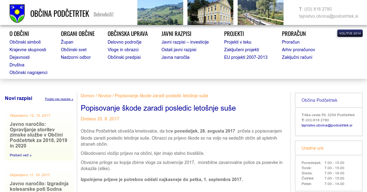 Občina Podčetrtek obvešča kmetovalce, da bo v ponedeljek, 28. avgusta 2017 pričela s popisovanjem škode zaradi posledic letošnje suše. Obrazci za prijavo škode so na voljo na sedežih občin ali spletnih straneh občin. Oškodovanci vložijo prijavo na občini, kjer imajo stalno bivališče. Obvezne priloge so kopija zbirne vloge za subvencije 2017, morebitne zavarovalne police za