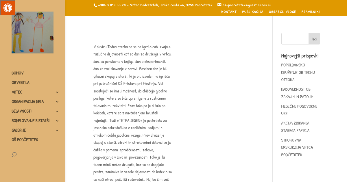 V okviru Tedna otroka so se po igralnicah izvajale različne dejavnosti kot so dan za druženje v vrtcu, dan, da pokukamo v knjige, dan z eksperimenti, dan za raziskovanje v naravi. Poseben dan je bil gibalni skupaj s starši, ki je bil izveden na igrišču pri podružnični OŠ Pristava pri Mestinju. Vsi sodelujoči so imeli možnost, da obiščejo gibalne postaje, katere so bile opremljene z različnimi telovadnimi rekviziti. Prav tako pa je dišalo po kokicah, katere so z navdušenjem hrustali najmlajši. Tudi »TETKA JESEN« je poskrbela za jesensko dobrodošlico z različnim sadjem in otrokom delila jabolčne režnje. Prav druženje skupaj s starši, otroki in strokovnimi delavci se je čutilo v pomenu sproščenosti, zabave, pogovarjanja v živo in povezanosti. Tako je ta teden minil malce drugače, ker so se dogajale pestre, zanimive in vesele dejavnosti ob katerih so se naši otroci počutili radovedni… Naj bo čim več takšnih čudovitih tednov obdanih s sončkom in posutim z obilico krasnih trenutkov, ki ustvarjajo najlepše spomine. Hvaležni smo lahko, da smo bili obdani z zanimivostmi TEDNA OTROKA!