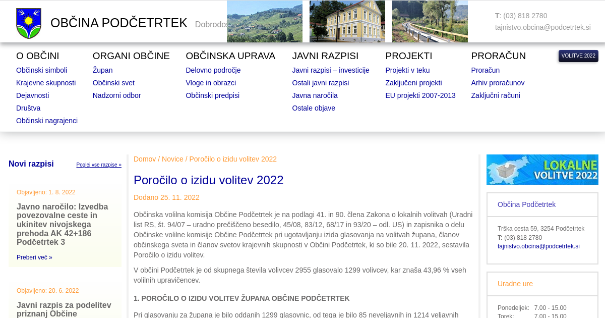 Občinska volilna komisija Občine Podčetrtek je na podlagi 41. in 90. člena Zakona o lokalnih volitvah (Uradni list RS, št. 94/07 – uradno prečiščeno besedilo, 45/08, 83/12, 68/17 in 93/20 – odl. US) in zapisnika o delu Občinske volilne komisije Občine Podčetrtek pri ugotavljanju izida glasovanja na volitvah župana, članov občinskega sveta in članov svetov