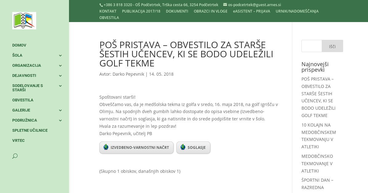 Spoštovani starši! Obveščamo vas, da je medšolska tekma iz golfa v sredo, 16. maja 2018, na golf igrišču v Olimju. Na spodnjih dveh gumbih lahko dostopate do opisa vsebine (Izvedbeno-varnostni načrt) in soglasja, ki ga natisnite in do srede podpišite ter vrnite v šolo. Hvala za razumevanje in lep pozdrav! Darko Pepevnik, učitelj PB