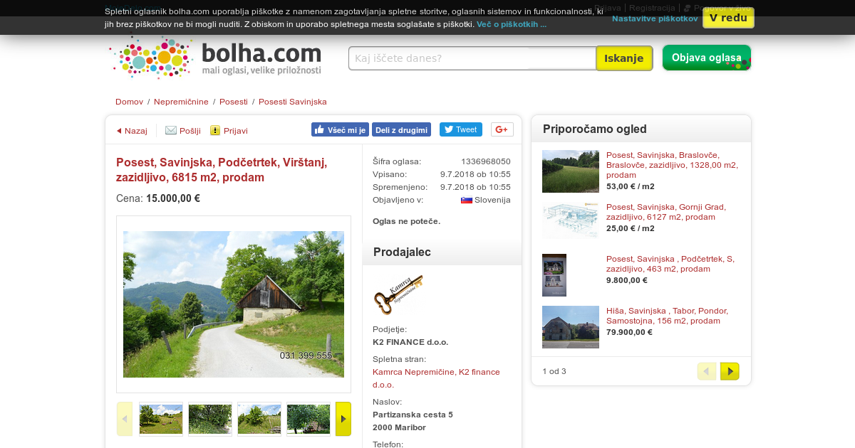 Tip:Zazidljivo Kraj/naselje: Virštanj Velikost: 6815, 00 m2 Zemljiška knjiga:urejena Dodaten opis: V čudovitem naravnem okolju v Virštanju, prodamo zemljišče,