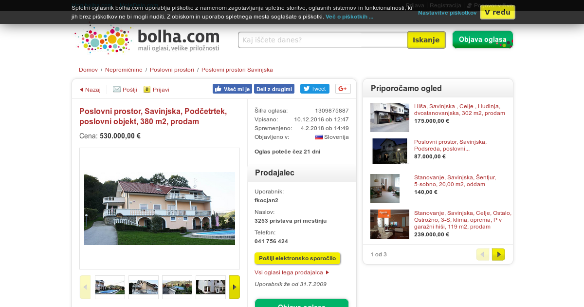 Tip posl. prostora: poslovni objekt Velikost: 380, 00 m2 Leto izgradnje: 1730 Zadnja adaptacija: 2001 Nadstropje: drugo