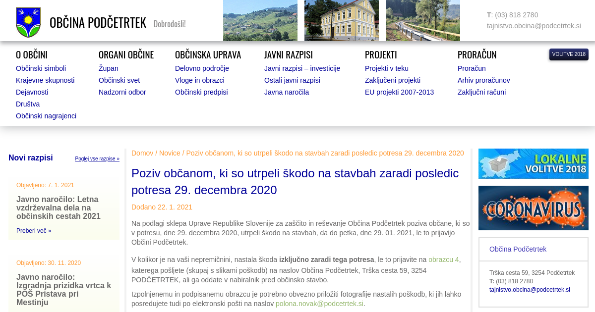 Na podlagi sklepa Uprave Republike Slovenije za zaščito in reševanje Občina Podčetrtek poziva občane, ki so v potresu, dne 29. decembra 2020, utrpeli škodo na stavbah, da do petka, dne 29. 01. 2021, le to prijavijo Občini Podčetrtek. V kolikor je na vaši nepremičnini, nastala škoda izključno zaradi tega potresa, le to prijavite na obrazcu