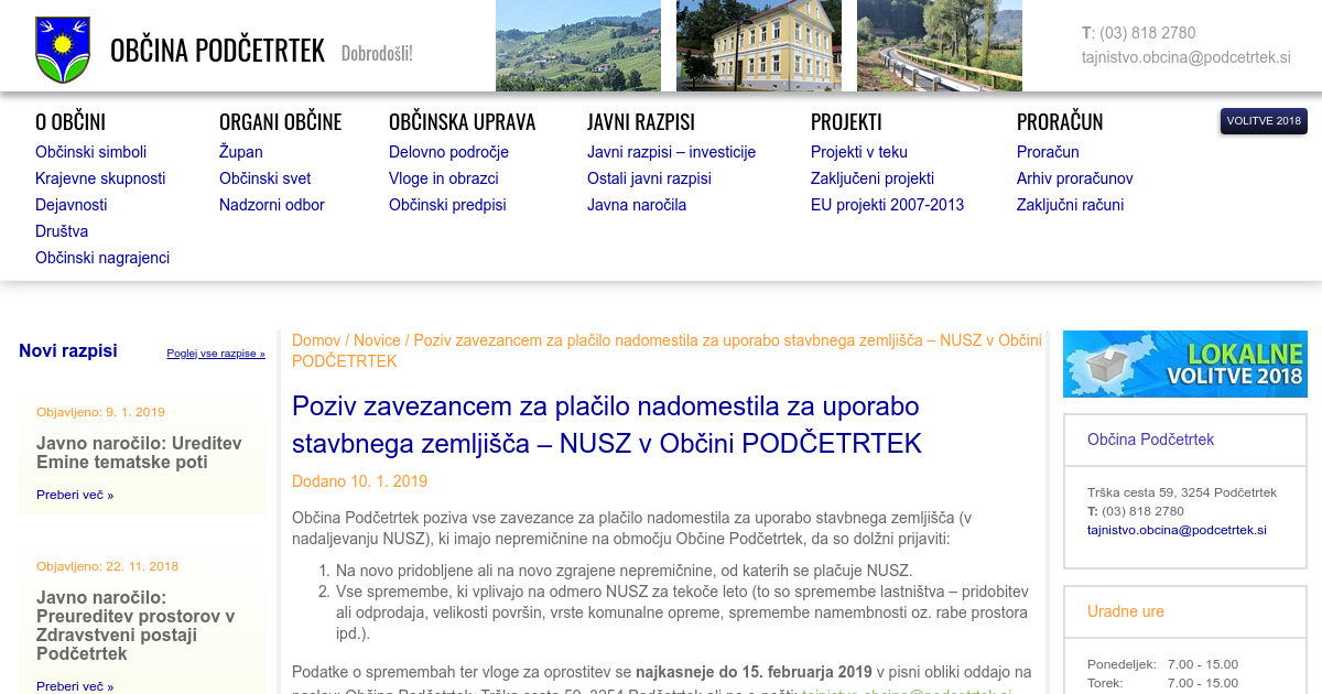 Občina Podčetrtek poziva vse zavezance za plačilo nadomestila za uporabo stavbnega zemljišča (v nadaljevanju NUSZ), ki imajo nepremičnine na območju Občine Podčetrtek, da so dolžni prijaviti: Na novo pridobljene ali na novo zgrajene nepremičnine, od katerih se plačuje NUSZ. Vse spremembe, ki vplivajo na odmero NUSZ za tekoče leto (to so spremembe lastništva – pridobitev