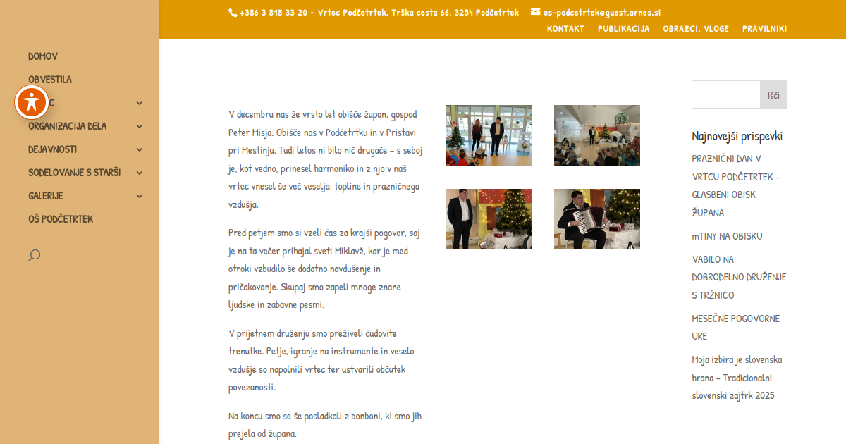 V decembru nas že vrsto let obišče župan, gospod Peter Misja. Obišče nas v Podčetrtku in v Pristavi pri Mestinju. Tudi letos ni bilo nič drugače – s seboj je, kot vedno, prinesel harmoniko in z njo v naš vrtec vnesel še več veselja, topline in prazničnega vzdušja.