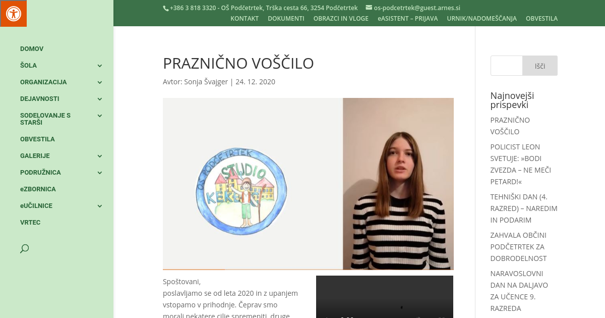 Spoštovani, poslavljamo se od leta 2020 in z upanjem vstopamo v prihodnje. Čeprav smo morali nekatere cilje spremeniti, druge opustiti, nam je na pot prineslo tudi nove priložnosti. Še bolj smo se povezali, skupaj posneli prisrčno voščilo in se med drugim tudi poklonili državnemu prazniku. Prijazno vabljeni k ogledu! Vsem se zahvaljujemo za srčno podporo in sodelovanje. Srečno 2021!