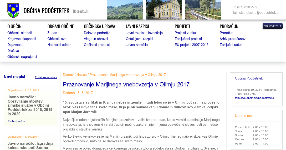 15. avgusta slavi Mati in Kraljica nebes in zemlje in tudi letos so jo v Olimju počastili s procesijo skozi vas Olimje ter s sveto mašo, ki jo je ob somaševanju domačih duhovnikov daroval celjski opat Marjan Jezernik. Največji in eden najstarejših Marijinih praznikov – veliki šmaren, dan, ko se verniki spominjajo Marijinega vnebovzetja, je