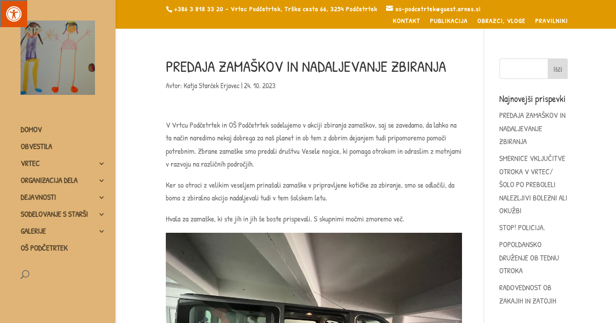 V Vrtcu Podčetrtek in OŠ Podčetrtek sodelujemo v akciji zbiranja zamaškov, saj se zavedamo, da lahko na ta način naredimo nekaj dobrega za naš planet in ob tem z dobrim dejanjem tudi pripomoremo pomoči potrebnim. Zbrane zamaške smo predali društvu Vesele nogice, ki pomaga otrokom in odraslim z motnjami v razvoju na različnih področjih.