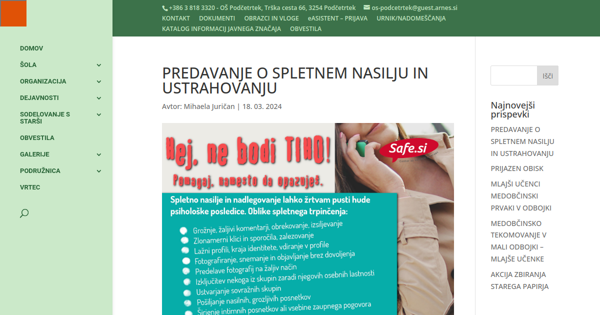 Tudi sedmošolci na naši šoli nadaljujejo z ozaveščanjem o varni rabi interneta in družabnih omrežij. V ponedeljek, 18. 3. 2024, so tako pod vodstvom strokovnjakinje iz spletnega mesta Safe.si sodelovali na predavanju in delavnicah na temo spletnega nasilja in ustrahovanja ter poglobili svoje vedenje o nevarnostih, ki prežijo na spletu, kako se jim izogniti ter kako ob morebitnem pojavu nasilja ustrezno ukrepati.