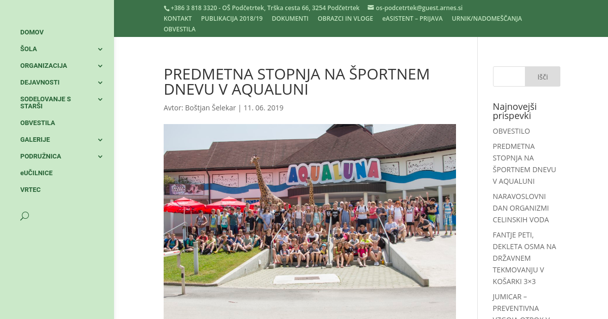 Zadnji športni dan za učenke in učence od šestega do devetega razreda smo izvedli v termalnem parku Aqualuna. Tja smo se po malici odpravili peš, učenci pa so v sončnem vremenu, izkoristili vse zabavne priložnosti, ki jih ponuja tamkajšnji vodni park. Poleg plavalnega dela je ob takšnih športnih dnevih pomembno, da učenke in učenci uživajo, ter krepijo vrstniške vezi. Vse našteto je zagotovo v polni meri uspelo, s tem pa so naši šolarji dobili dodatno energijo pred zaključkom šolskega leta, ki se nezadržno bliža.