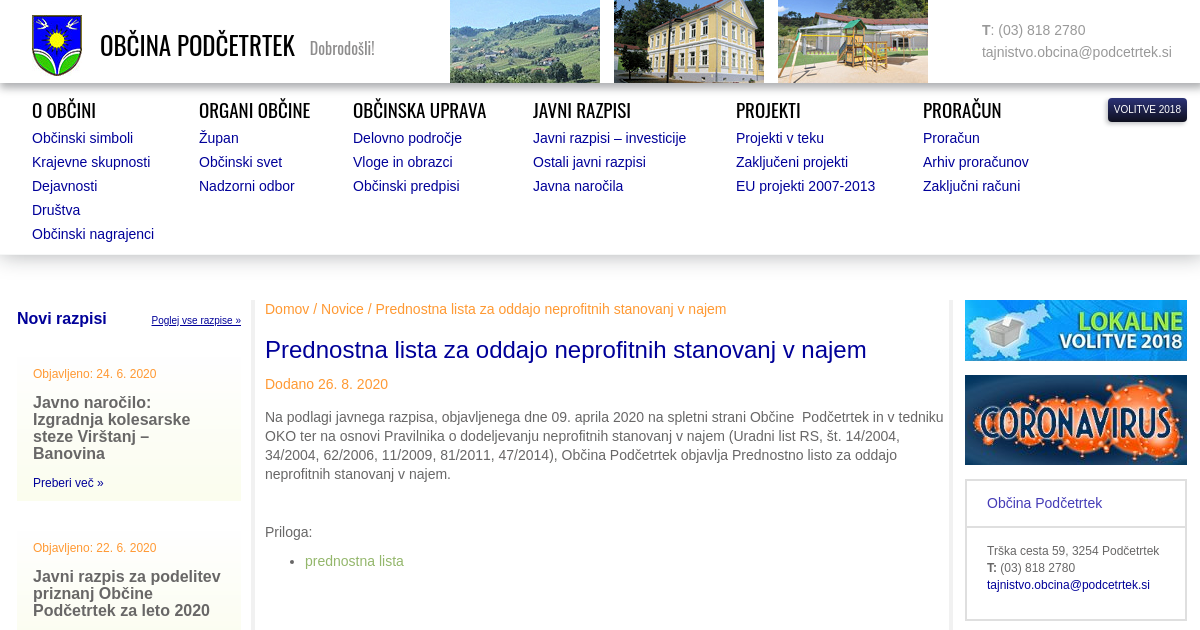 Na podlagi javnega razpisa, objavljenega dne 09. aprila 2020 na spletni strani Občine Podčetrtek in v tedniku OKO ter na osnovi Pravilnika o dodeljevanju neprofitnih stanovanj v najem (Uradni list RS, št. 14/2004, 34/2004, 62/2006, 11/2009, 81/2011, 47/2014), Občina Podčetrtek objavlja Prednostno listo za oddajo neprofitnih stanovanj v najem. Priloga: prednostna lista