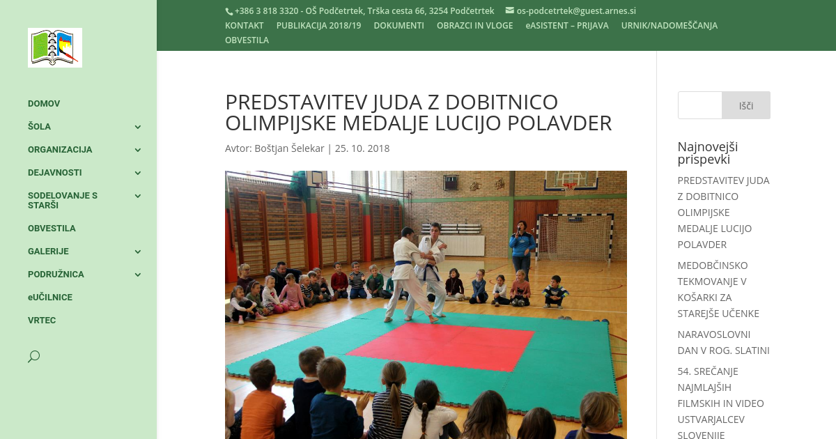 V sklopu rednih ur športne vzgoje je našo šolo obiskala ena najuspešnejših slovenskih športnic Lucija Polavder. Lucija je v svoji karieri osvojila medalje na praktično vseh pomembnejših turnirjih in tekmovanjih, krona njene kariere pa je bila vsekakor bronasta olimpijska medalja, ki jo je osvojila leta 2008 v Pekingu. Članica judo kluba Sankaku Celje je našim šolarjem matične in podružnične šole pobližje predstavila borilni šport judo. Na predstavitev je s sabo pripeljala dva perspektivna mlada judoista, ki sta našim učencem pobližje predstavila ta sicer zelo atraktiven, a zahteven šport. Nekaj malega so se v judu preizkusili tudi naši učenci, a za kaj več jih je Lucija povabila na treninge. Po koncu predstavitve smo našo olimpijko malce povprašali o njeni karieri in temu, kako postati vrhunski športnik.