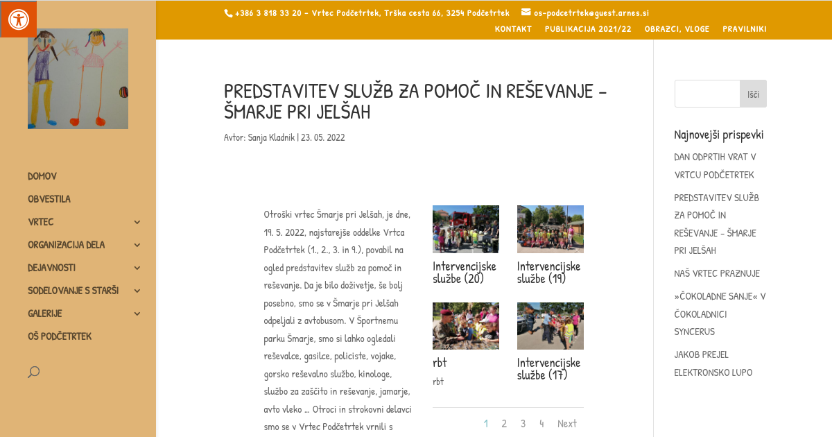 Otroški vrtec Šmarje pri Jelšah, je dne, 19. 5. 2022, najstarejše oddelke Vrtca Podčetrtek (1., 2., 3. in 9.), povabil na ogled predstavitev služb za pomoč in reševanje. Da je bilo doživetje, še bolj posebno, smo se v Šmarje pri Jelšah odpeljali z avtobusom. V Športnemu parku Šmarje, smo si lahko ogledali reševalce, gasilce, policiste, vojake, gorsko reševalno službo, kinologe, službo za zaščito in reševanje, jamarje, avto vleko … Otroci in strokovni delavci smo se v Vrtec Podčetrtek vrnili s spomini zanimivih doživetij in novim znanjem, o različnih službah za pomoč in reševanje.