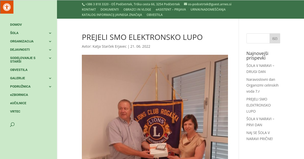 V torek, 21. junija 2022, smo v OŠ Podčetrtek imeli prav poseben dogodek z dobrodelno noto, saj smo v last prejeli prenosno elektronsko lupo za delo s težko slabovidnim učencem, ki bo s 1. septembrom pričel obiskovati prvi razred naše šole.