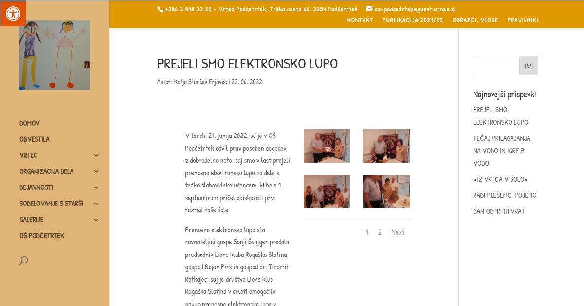 V torek, 21. junija 2022, se je v OŠ Podčetrtek odvil prav poseben dogodek z dobrodelno noto, saj smo v last prejeli prenosno elektronsko lupo za delo s težko slabovidnim učencem, ki bo s 1. septembrom pričel obiskovati prvi razred naše šole.