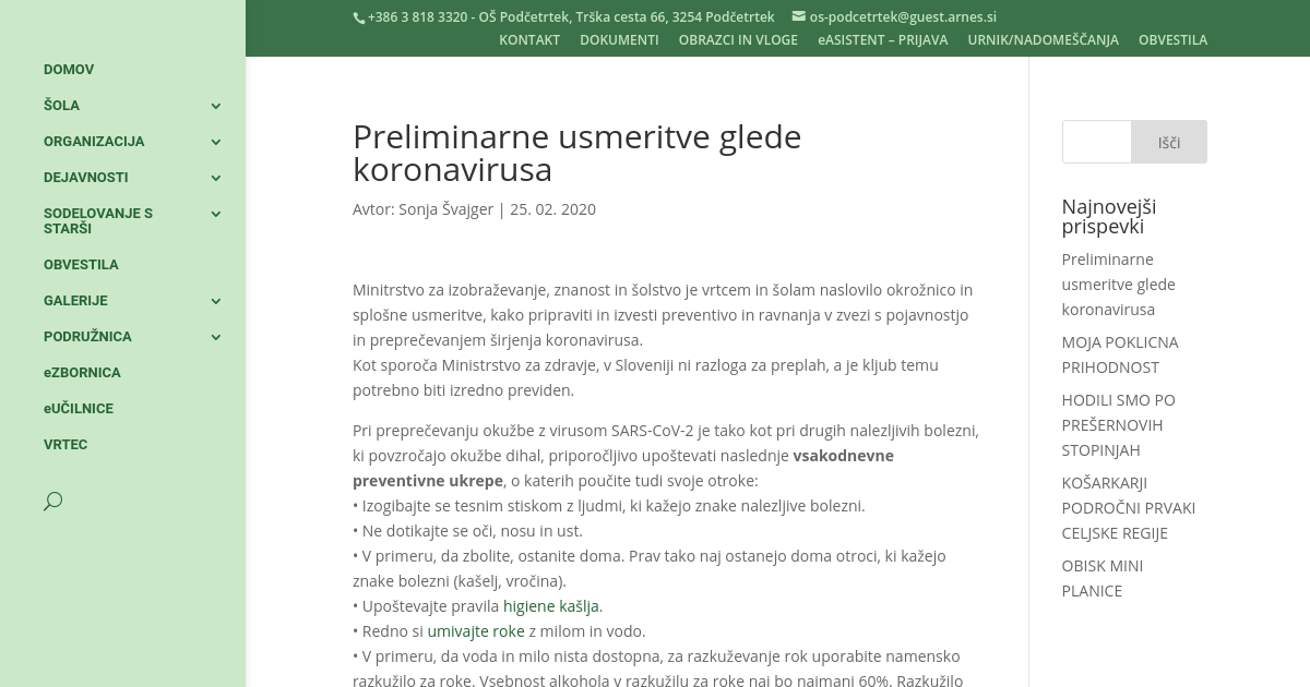 Minitrstvo za izobraževanje, znanost in šolstvo je vrtcem in šolam naslovilo okrožnico in splošne usmeritve, kako pripraviti in izvesti preventivo in ravnanja v zvezi s pojavnostjo in preprečevanjem širjenja koronavirusa. Kot sporoča Ministrstvo za zdravje, v Sloveniji ni razloga za preplah, a je kljub temu potrebno biti izredno previden.