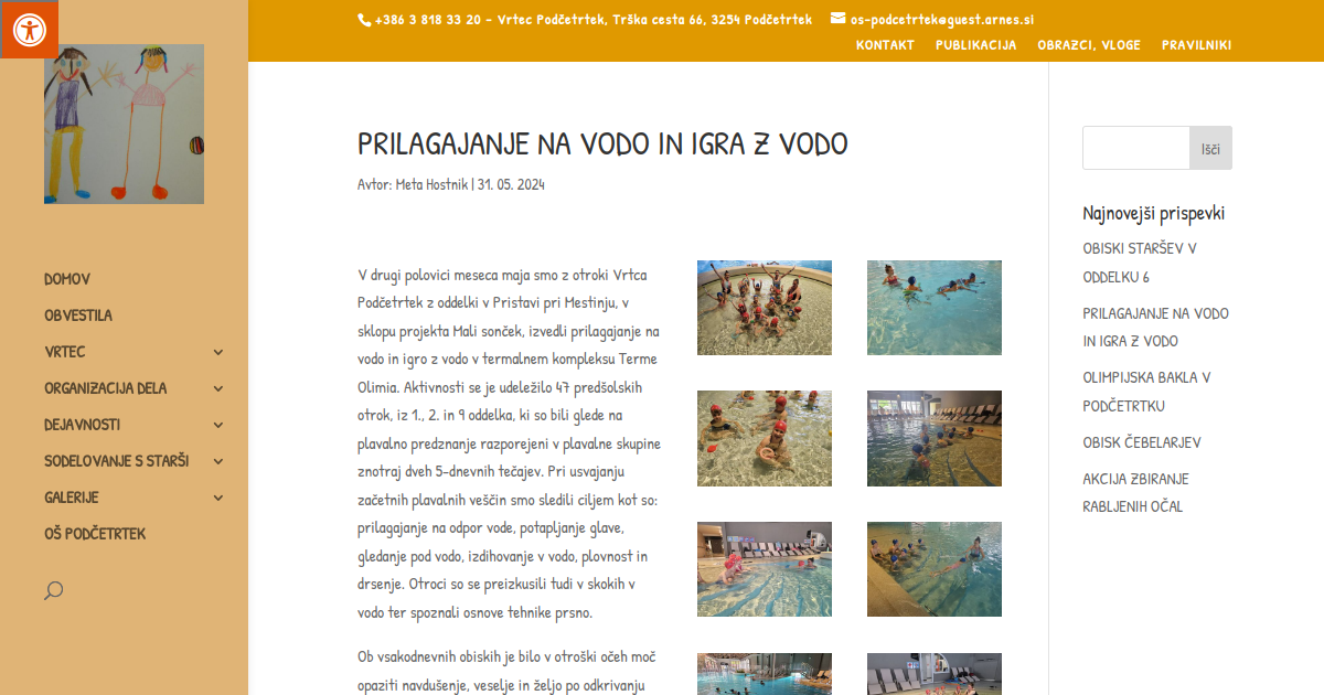 V drugi polovici meseca maja smo z otroki Vrtca Podčetrtek z oddelki v Pristavi pri Mestinju, v sklopu projekta Mali sonček, izvedli prilagajanje na vodo in igro z vodo v termalnem kompleksu Terme Olimia. Aktivnosti se je udeležilo 47 predšolskih otrok, iz 1., 2. in 9 oddelka, ki so bili glede na plavalno predznanje razporejeni v plavalne skupine znotraj dveh 5-dnevnih tečajev. Pri usvajanju začetnih plavalnih veščin smo sledili ciljem kot so: prilagajanje na odpor vode, potapljanje glave, gledanje pod vodo, izdihovanje v vodo, plovnost in drsenje. Otroci so se preizkusili tudi v skokih v vodo ter spoznali osnove tehnike prsno.